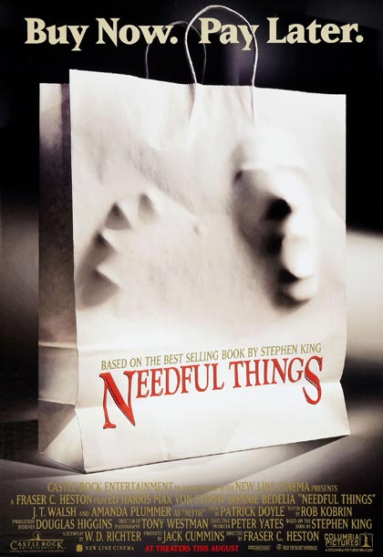 A mysterious newcomer to the coastal town of Castle Rock, Leland Gaunt (Academy Award-nominee Max von Sidow) opens a new shop called “Needful Things”. Anyone who enters his store finds the object of his or her lifelong dreams and desires: a prized baseball card, a carnival glass lampshade, a healing amulet. The prices are too good to be true, but in exchange, Gaunt requires each person to play a small harmless prank on someone else in Castle Rock… The Faustian bargain seems like a small price to pay for one’s life’s desire… but is it? Sheriff Alan Pangborn (Academy Award-nominee Ed Harris) doesn’t think so as violence escalates in his once peaceful town and it is up to him and his girl friend Polly (Bonnie Bedelia) to stop Gaunt before he destroys Castle Rock, in this Stephen King classic directed by Fraser C. Heston.